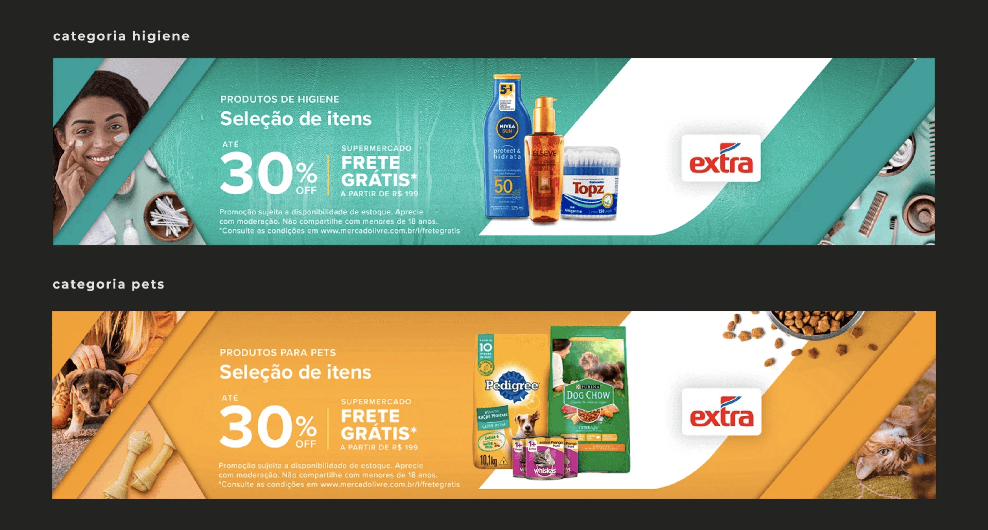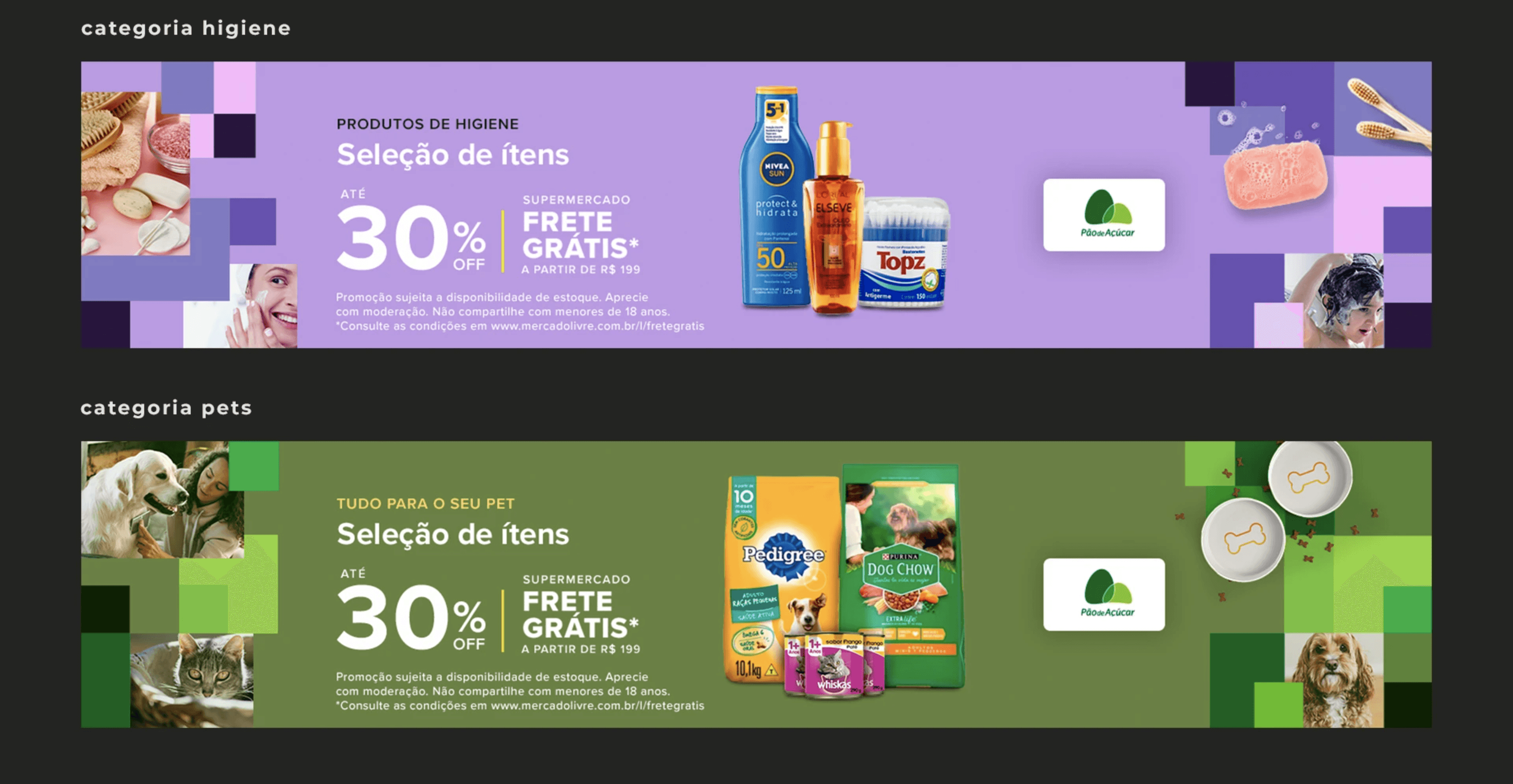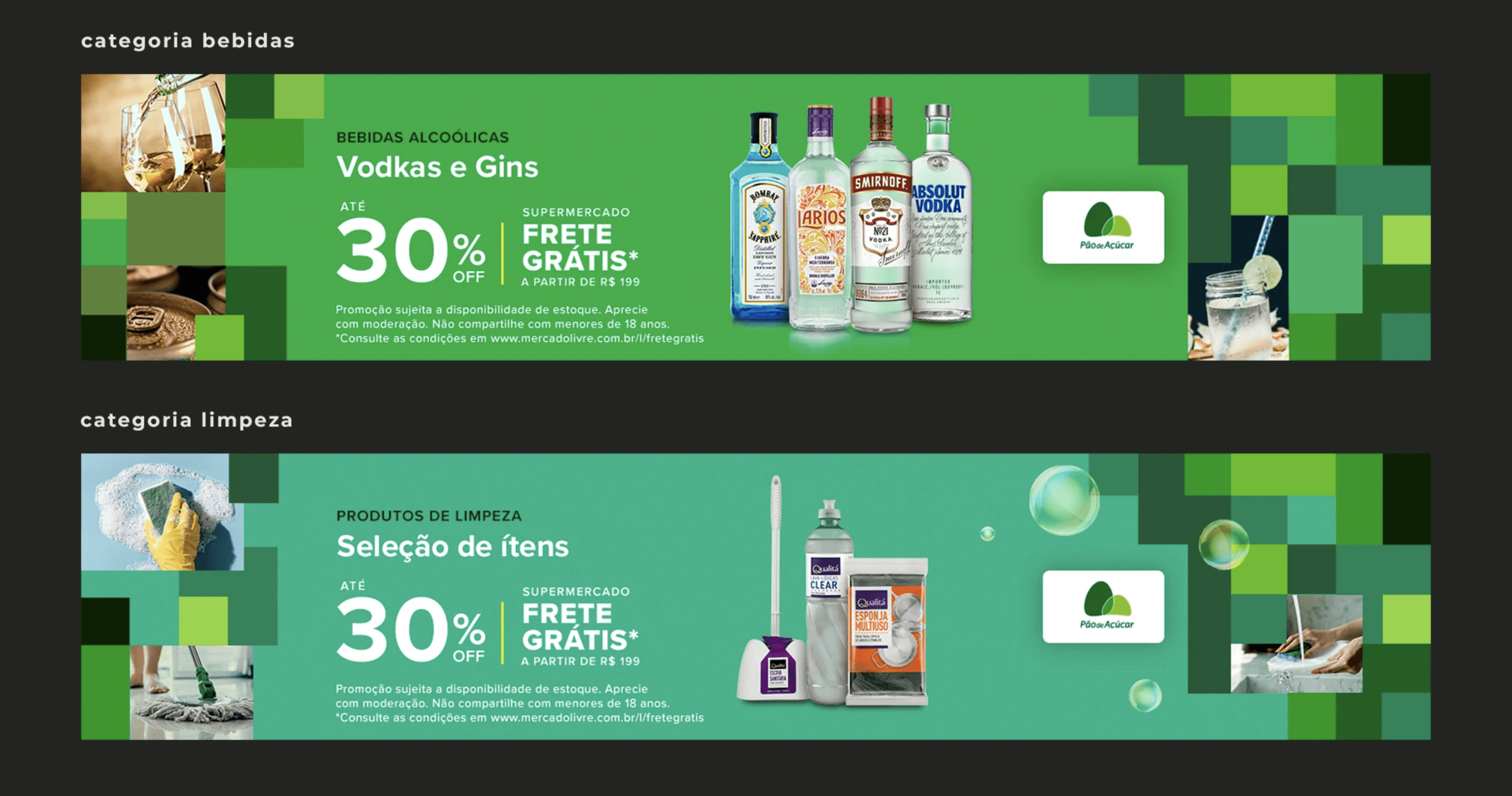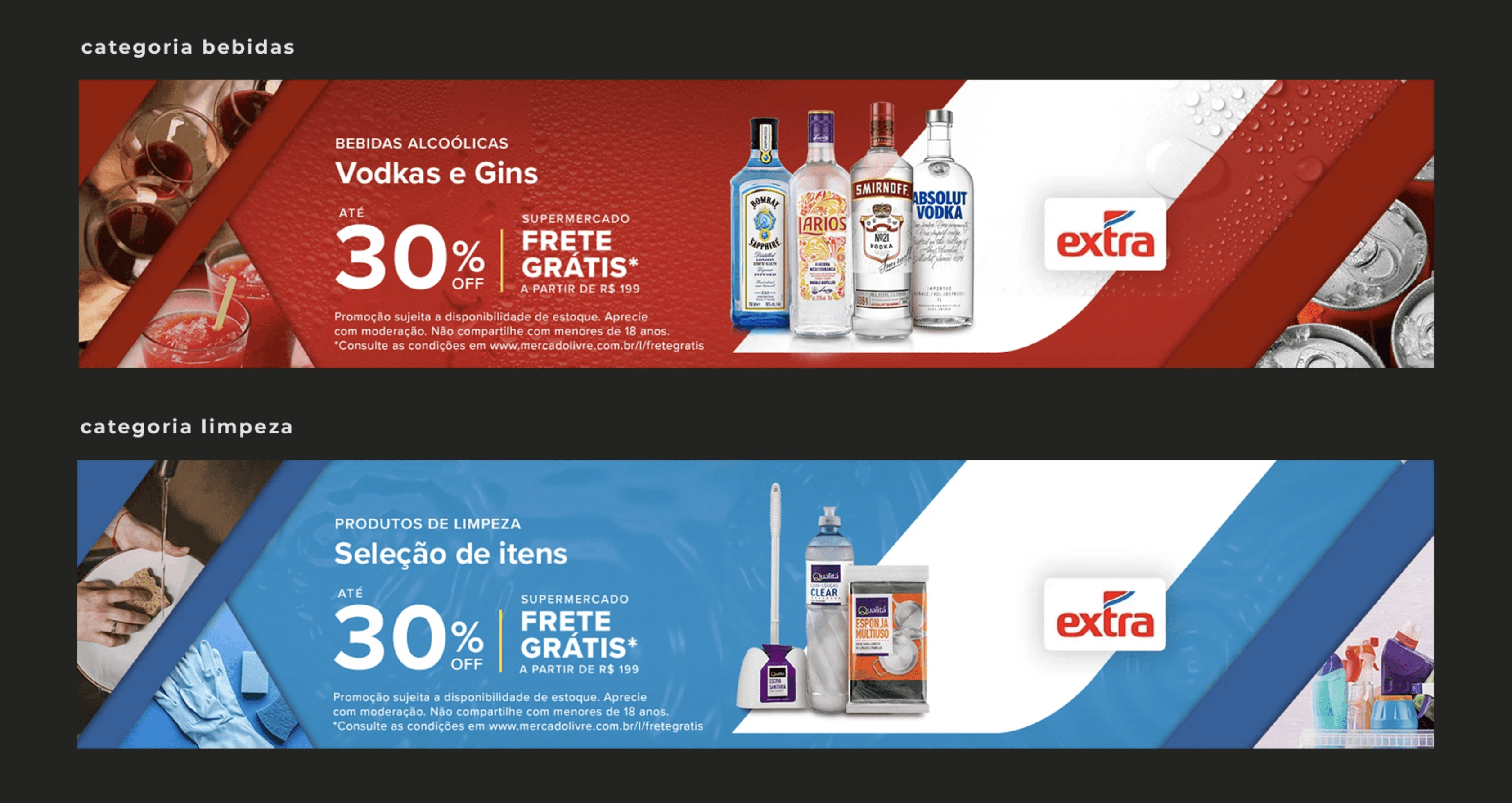 Criação de KV para divulgação da loja Pão de Açúcar e Clube Extra dentro da plataforma Mercado Livre. Templates desenvolvidos para construção de layout de ofertas, divididos nas categorias: Bebidas alcóolicas, Limpeza, Higiene e Pets;