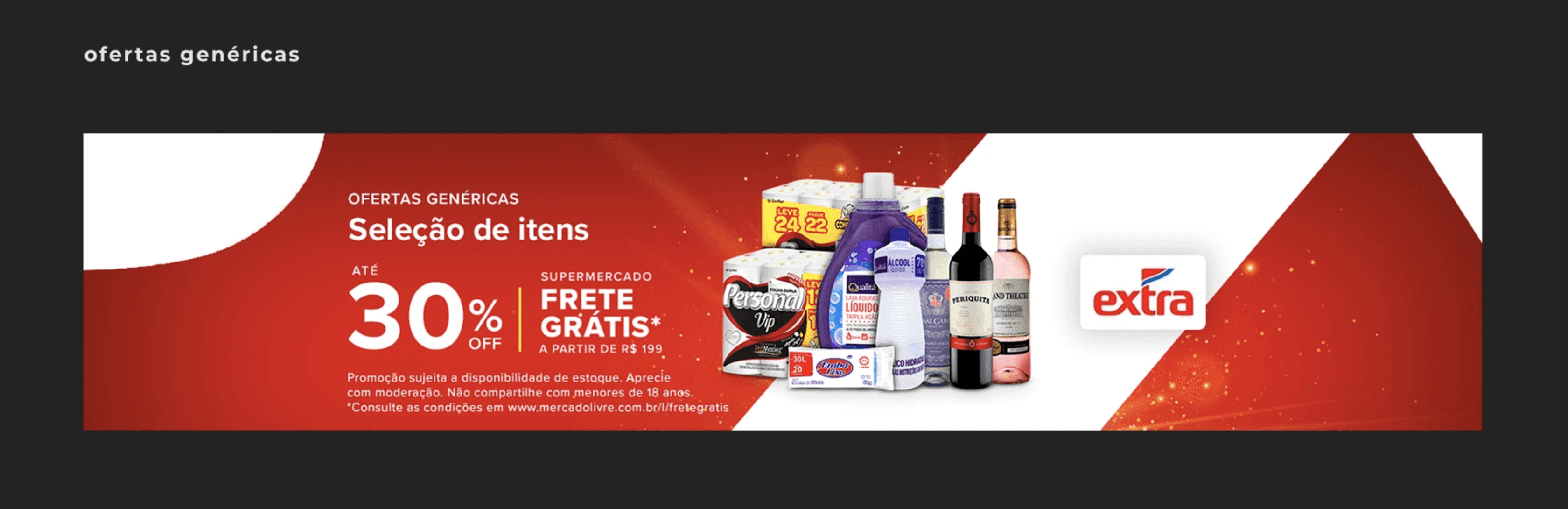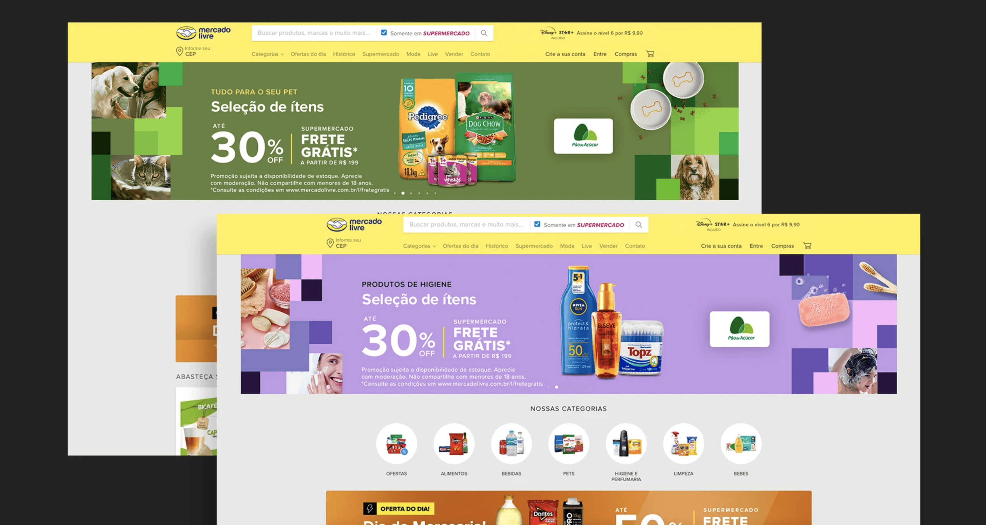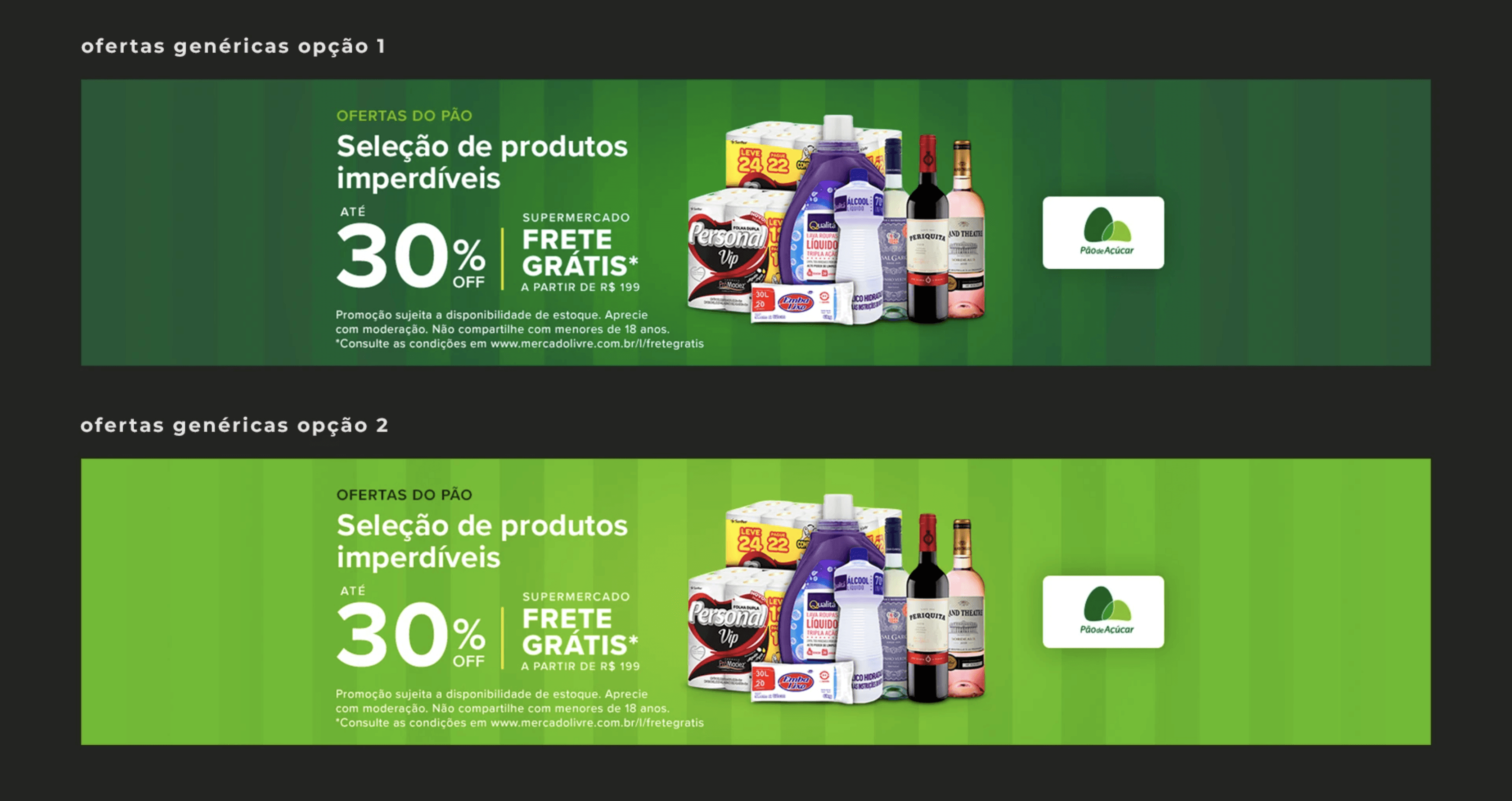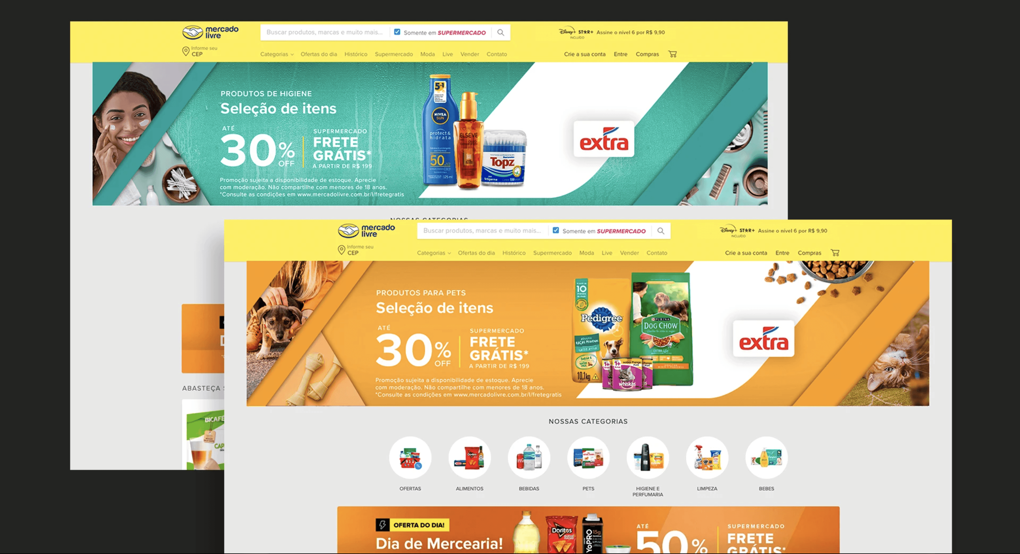 Criação de KV para divulgação da loja Pão de Açúcar e Clube Extra dentro da plataforma Mercado Livre. Templates desenvolvidos para construção de layout de ofertas, divididos nas categorias: Bebidas alcóolicas, Limpeza, Higiene e Pets;